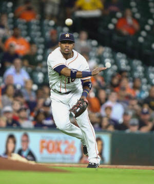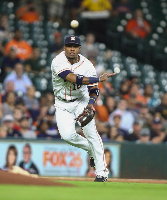 Astros third baseman Luis Valbuena (18) throws out a runner at first