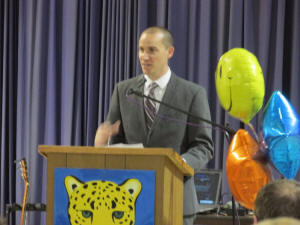 Chris Allen, the principal of Jefferson for the last two years, also spoke to the guests. Allen said he was a student in District 27 as a child. Allen said that Jefferson School has always created the image of a neighborhood school, where kids from the same classes played together outside of the building. Allen said that working at Jefferson, he appreciates the “comradery, collaboration, the atmosphere that these teachers come here every day leaving one family to come to another,” said Allen.