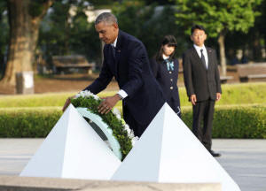 President Barack Obama lays a wreath at a cenotaph at Hiroshima