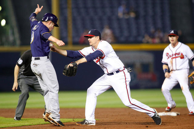 Braves second baseman Kelly Johnson (24) tags out Milwaukee Brewers