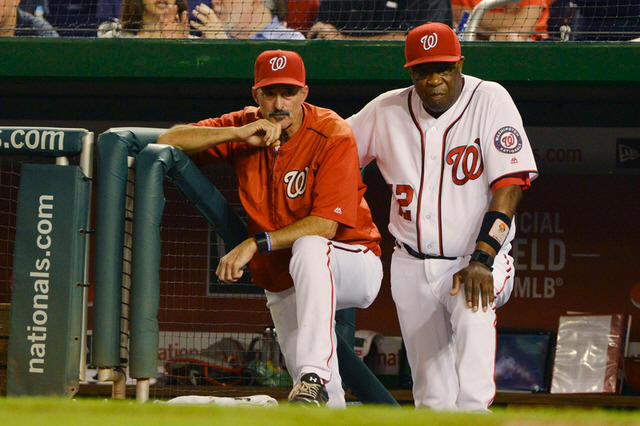 Nationals manager Dusty Baker (12) and pitching coach Mike Maddux