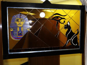 Another striking piece in the collection is the one with an Egyptian theme that features pyramids, the Egyptian Eye of Ra, and the Egyptian Mau or sacred black cat.