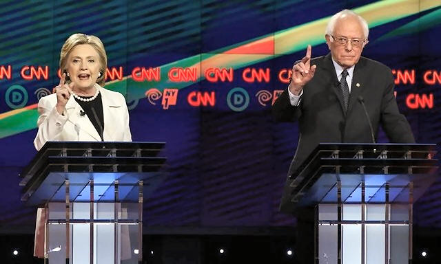Bernie Sanders both gesture during a Democratic debate hosted by CNN
