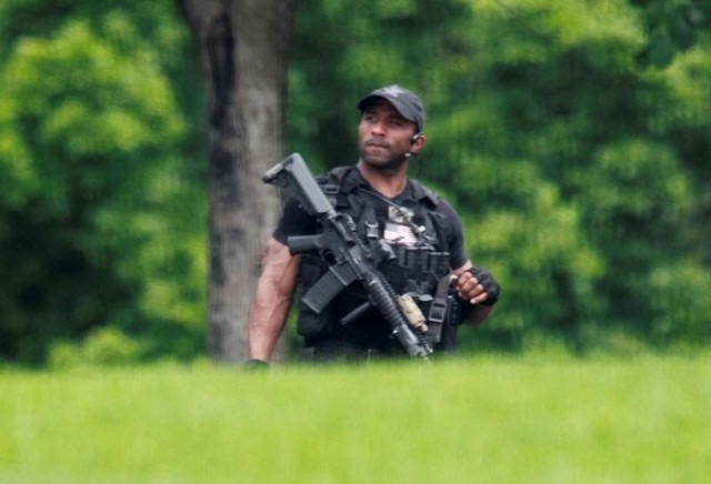 U.S. Secret Service Counter-assault Team member is seen through a window