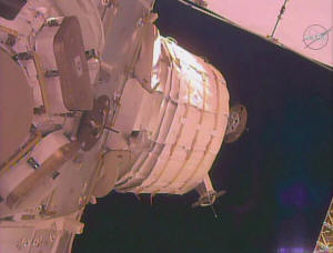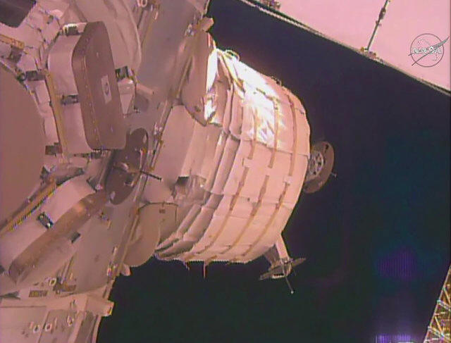 The unexpanded Bigelow Expandable Activity Module (BEAM) is seen