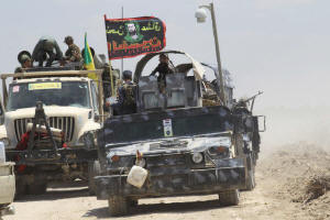 Iraqi security forces and Shi'ite fighters sit in military vehicles