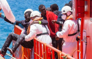 boat around 100 miles off the coast, is helped by rescue workers upon
