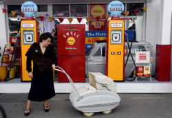 A woman holds the handle of an old pram in front of vintage Shell
