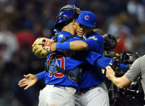 Cubs players Willson Contreras (40) and Addison Russell celebrate