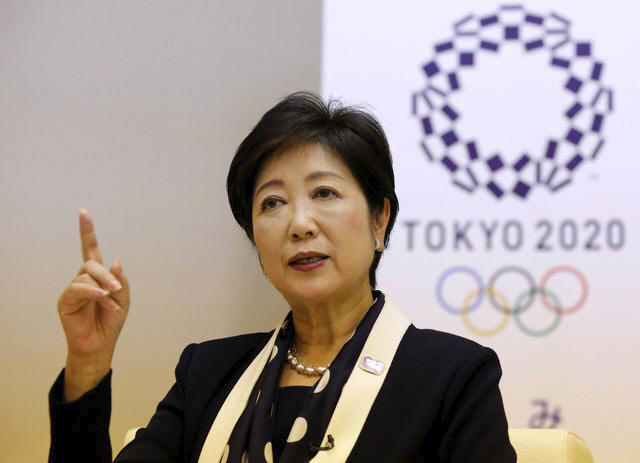 Tokyo Governor Yuriko Koike speaks in front of Tokyo 2020 Olympics