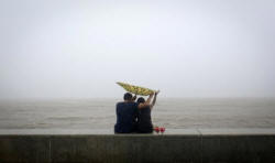 A couple tries to hold on to an umbrella flipped inside out at a sea