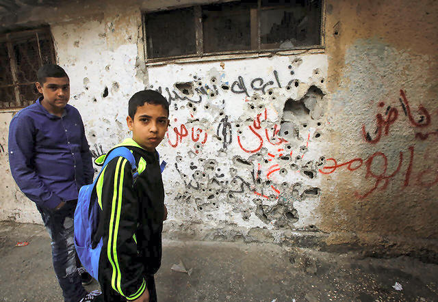 Palestinian school boys stand in front of a wall damaged by bullets