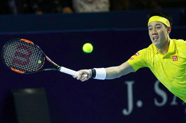 Kei Nishikori of Japan returns a ball to Marin Cilic of Croatia.