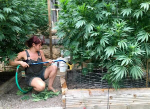 An unnamed worker waters cannabis plants on Steve Dillon's farm in