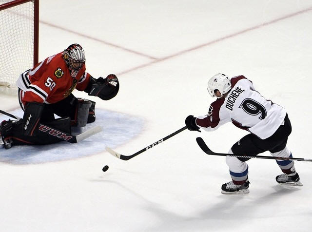 Avalanche center Matt Duchene (9) shoots on Chicago Blackhawks