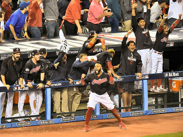 Cleveland Indians players including Carlos Santana celebrate a