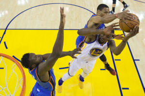 Thunder guard Russell Westbrook (0) blocks the shot of Golden State