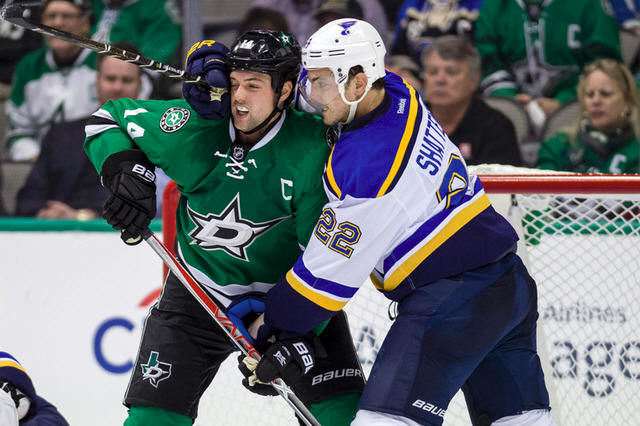 Blues defenseman Kevin Shattenkirk (22) defends against Dallas Stars