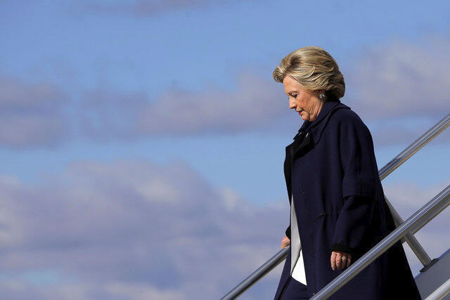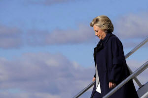 Democratic presidential nominee Hillary Clinton gets off her