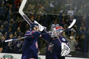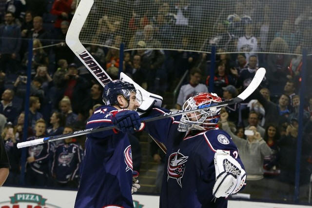 Blue Jackets left wing Nick Foligno (71) and goalie Sergei Bobrovsky