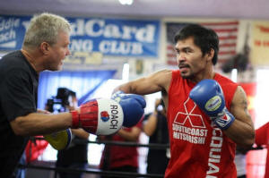 Boxer Manny Pacquiao of the Philippines (R) works out with his