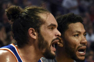 New York Knicks center Joakim Noah (L) and guard Derrick Rose (25)