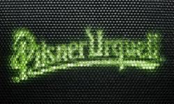 A logo of Plzensky Prazdroj (Pilsner Urquell) brewery is seen behind
