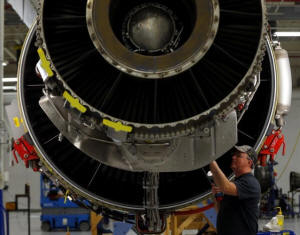 General Electric employee Ron Carlson inspects a CF6-80C engine at