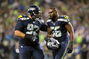 Seahawks defensive end Cliff Avril (56) is greeted by defensive