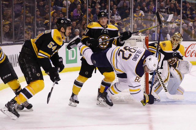 Sabres left wing Marcus Foligno (82) gets up ended by Boston Bruins