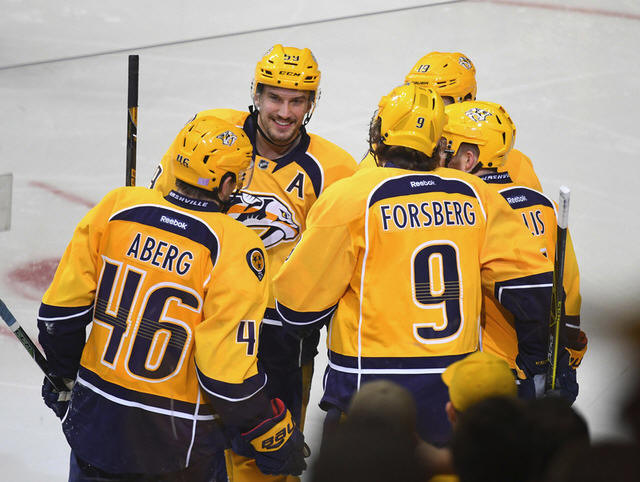 Predators players celebrate after a goal by defenseman Ryan Ellis