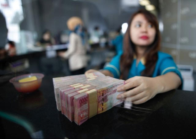 A teller at a money changer handles Indonesia rupiah bank notes in