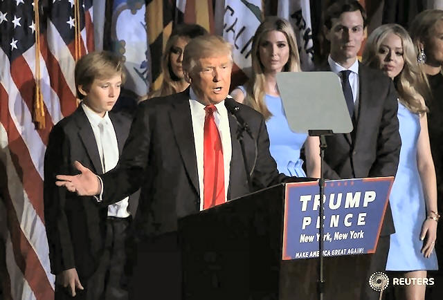 members of his family as he addresses supporters at his election