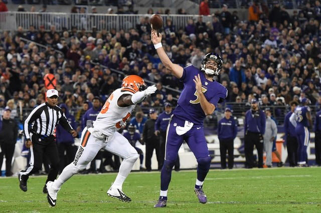 Ravens quarterback Joe Flacco (5) throws as Cleveland Browns inside