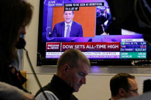A television shows a CNBC headline "Dow Sets All-Time High" as