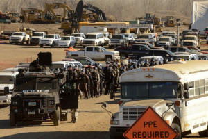 Police stand guard in a Dakota Access pipeline construction facility