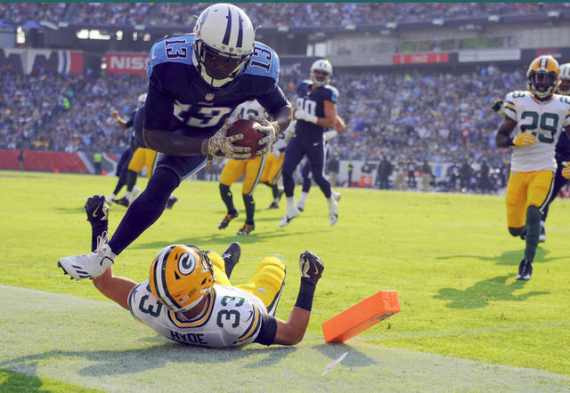Titans wide receiver Kendall Wright (13) scores after a reception