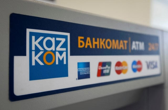 The logo of Kazkommertsbank (KKB) is pictured on an automated teller