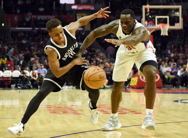 Nets guard Yogi Ferrell (10) battles for the ball with Los Angeles