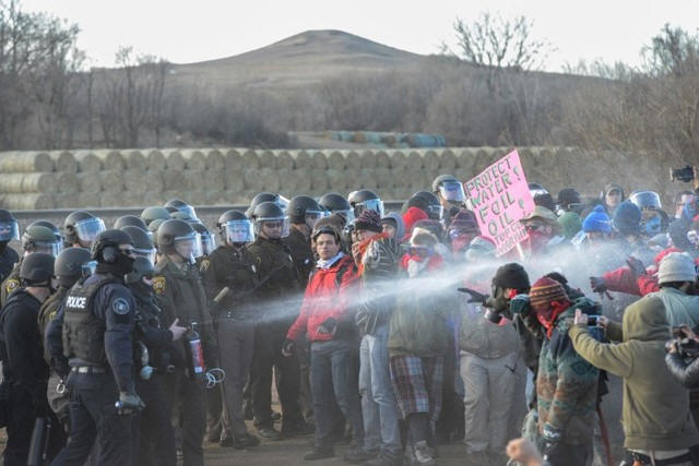 Police mace protesters during a demonstration against the Dakota