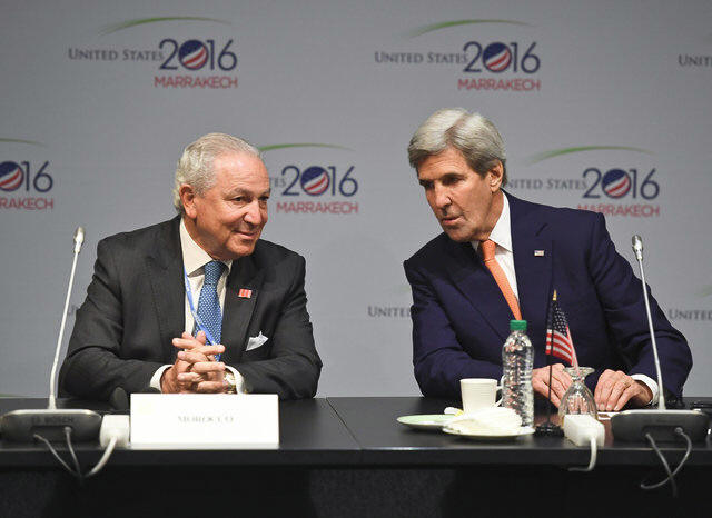 Kerry talks with former Moroccan ambassador to the U.S. Aziz Mekouar