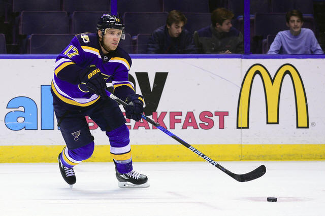 Blues left wing Jaden Schwartz (17) handles the puck against the