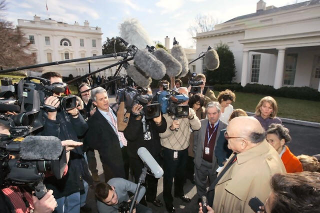 surrounded by reporters as he departs the White House in Washington,