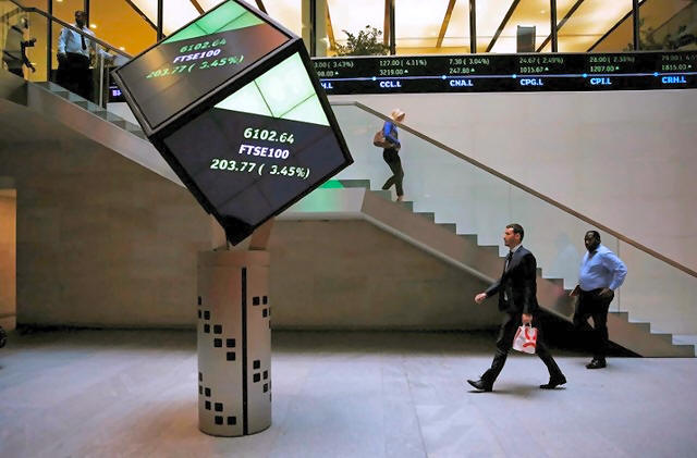People walk through the lobby of the London Stock Exchange in