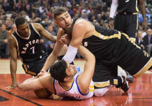 Raptors center Jonas Valanciunas (17) battles for a loose ball with