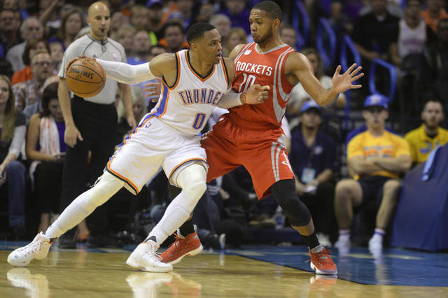 Thunder guard Russell Westbrook (0) drives to the basket as Houston