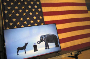 screen at Democratic U.S. presidential candidate Hillary Clinton's