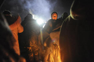 A protester gets warm by a fire during a protest against plans to