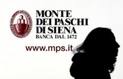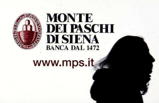 A Monte dei Paschi di Siena advertisement is seen on a screen in a