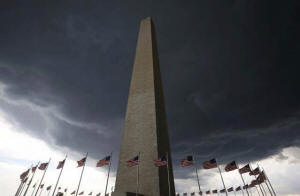 Storm clouds hover above the Washington monument in Washington D.C.,